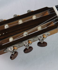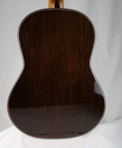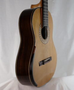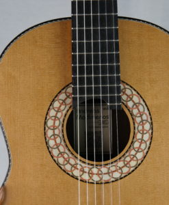 Andreas Madimenos, since is number 48 from 2022 is building a new model. His new guitars are amazing and can easily compete with the best Australian lattice guitar. The No 44 is his previous model which is lighter – 2,5 kg- and so different from his new guitars. The guitar is lattice braced but without and carbon nor balsa, just wood for a woody sound. What strikes us are the warm color tone and the thick notes. The playability is perfect. Last but not least , the guitar is available at a very reasonable price.
