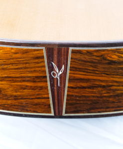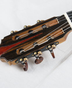 This double-top guitar weighs 1.6 kg. The whole guitar is the result of Charalampos analysis and not a copy from the German double-top. The guitar has a solid cocobolo rosewood back and an unusual for doubletop double-side which gives more mass to the guitar and long sustain.