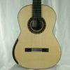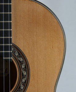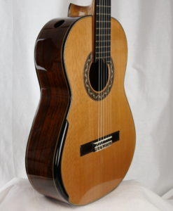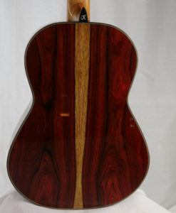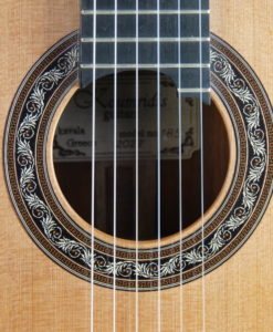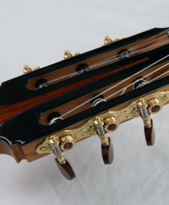 This double-top guitar weighs 1.8 kg. The whole guitar is the result of Charalampos analysis and not a copy from the German double-top. The guitar has a solid cocobolo rosewood back and an unusual for doubletop double-side which gives more mass to the guitar and long sustain.