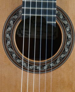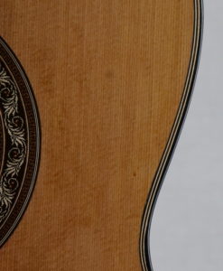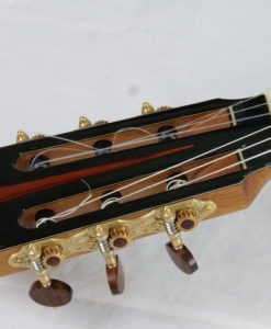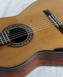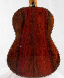 This double-top guitar weighs 1.8 kg. The whole guitar is the result of Charalampos analysis and not a copy from the German double-top. The guitar has a solid cocobolo rosewood back and an unusual for doubletop double-side which gives more mass to the guitar and long sustain.