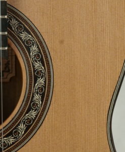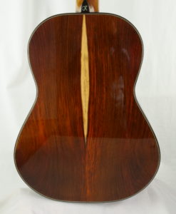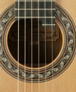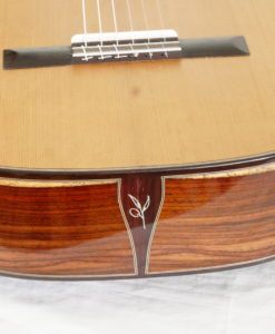 This double-top guitar weighs 1.8 kg. The whole guitar is the result of Charalampos analysis and not a copy from the German double-top. The guitar has a solid cocobolo rosewood back and an unusual for doubletop double-side which gives more mass to the guitar and long sustain.