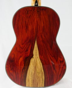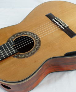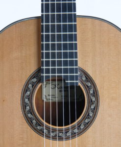 This double-top guitar weighs 1.8 kg. The whole guitar is the result of Charalampos analysis and not a copy from the German double-top. The guitar has a solid cocobolo rosewood back and an unusual for doubletop double-side which gives more mass to the guitar and long sustain.