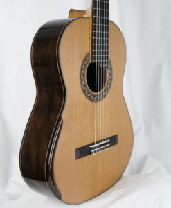Here we have a lattice braced guitar inspired by the Greg Smallman guitars. Everything has been said on the Greg Smallman sound, this lattice model of Charalampos sounds to us even better. You will find singing warm trebles, very thick notes with a long sustain and as well deep basses more natural sounding than the one you can find on the Greg Smallman guitars. Charalampos has worked in th direction of a more natural sound. The result is amazing.