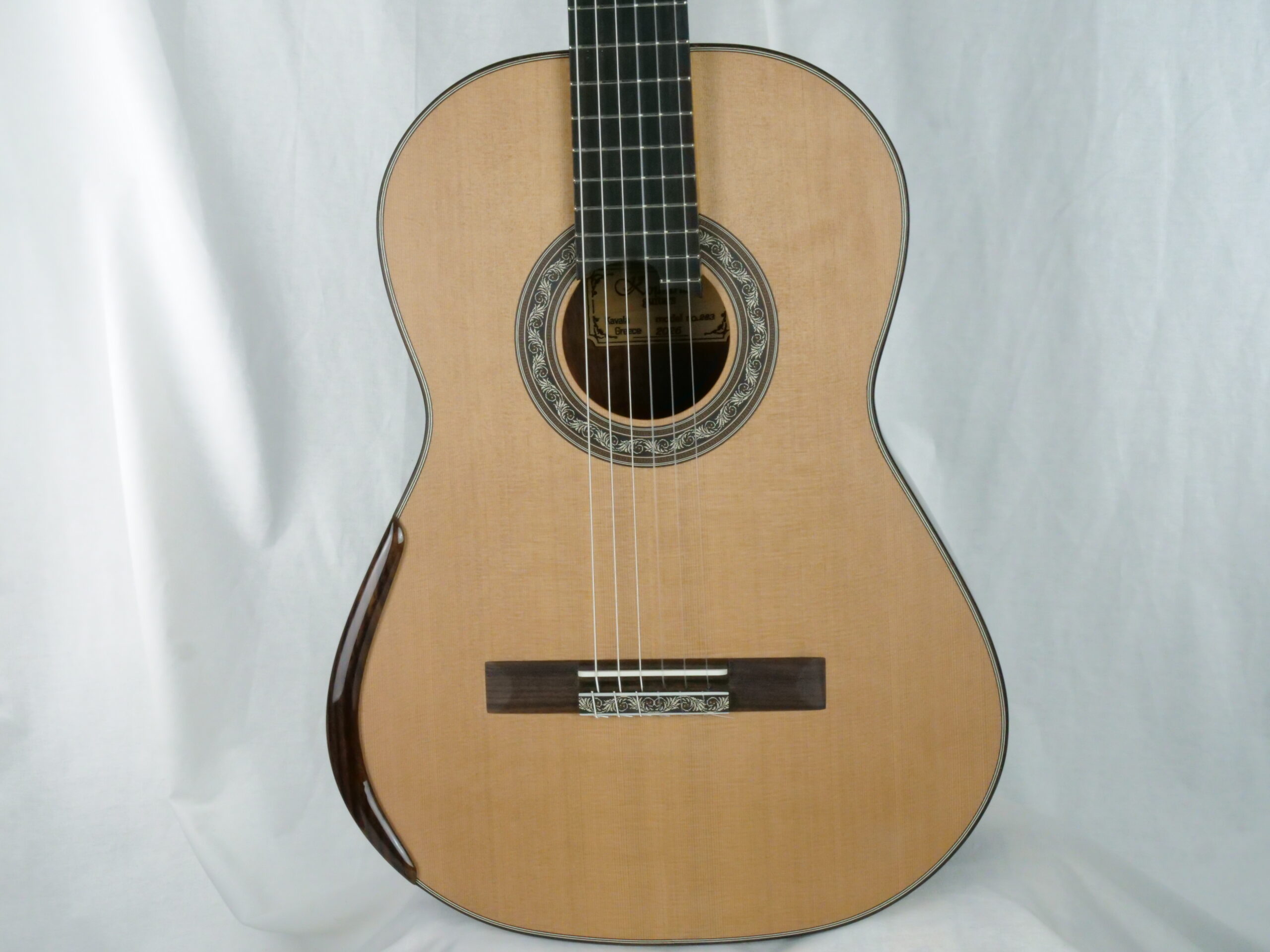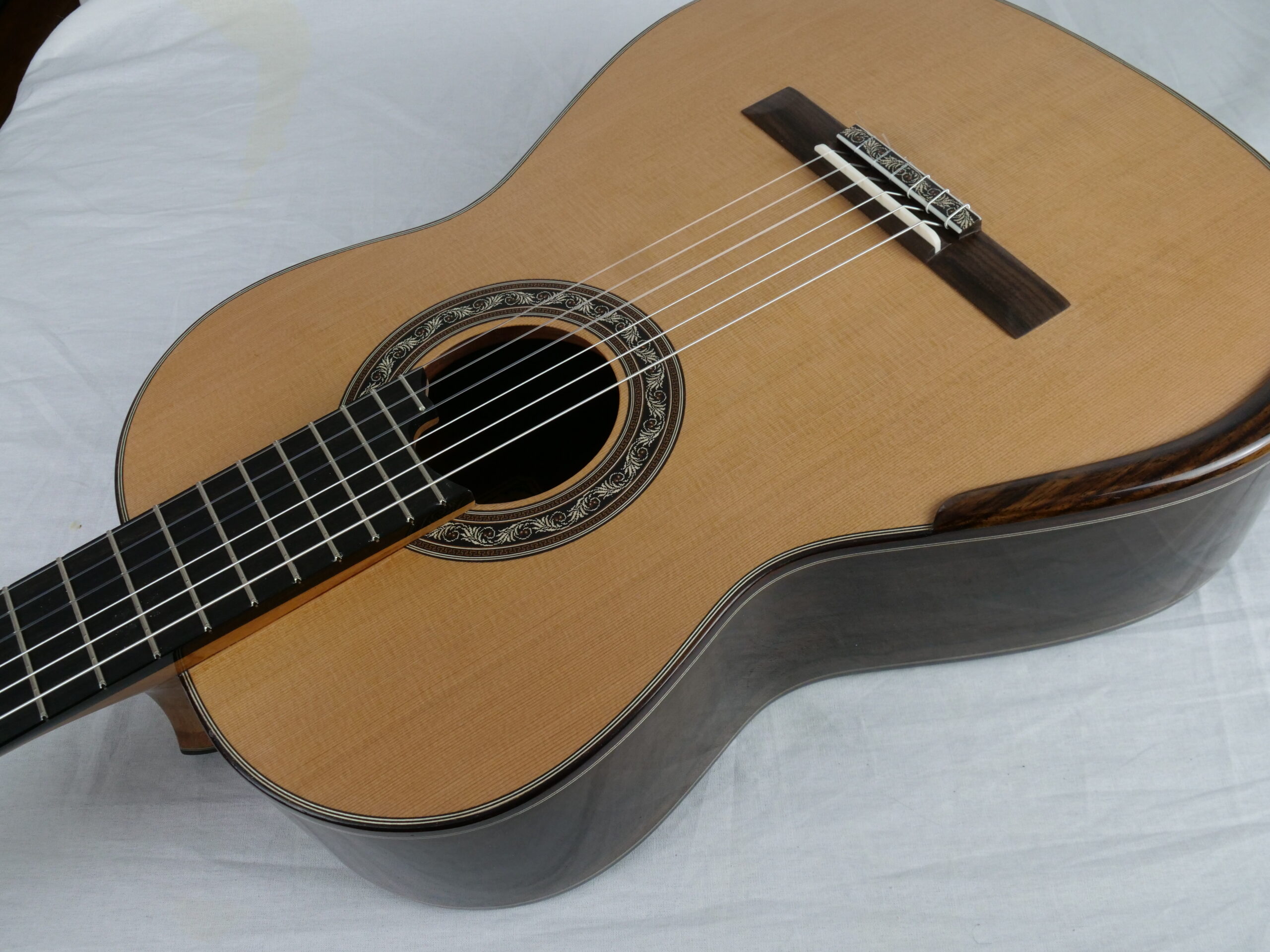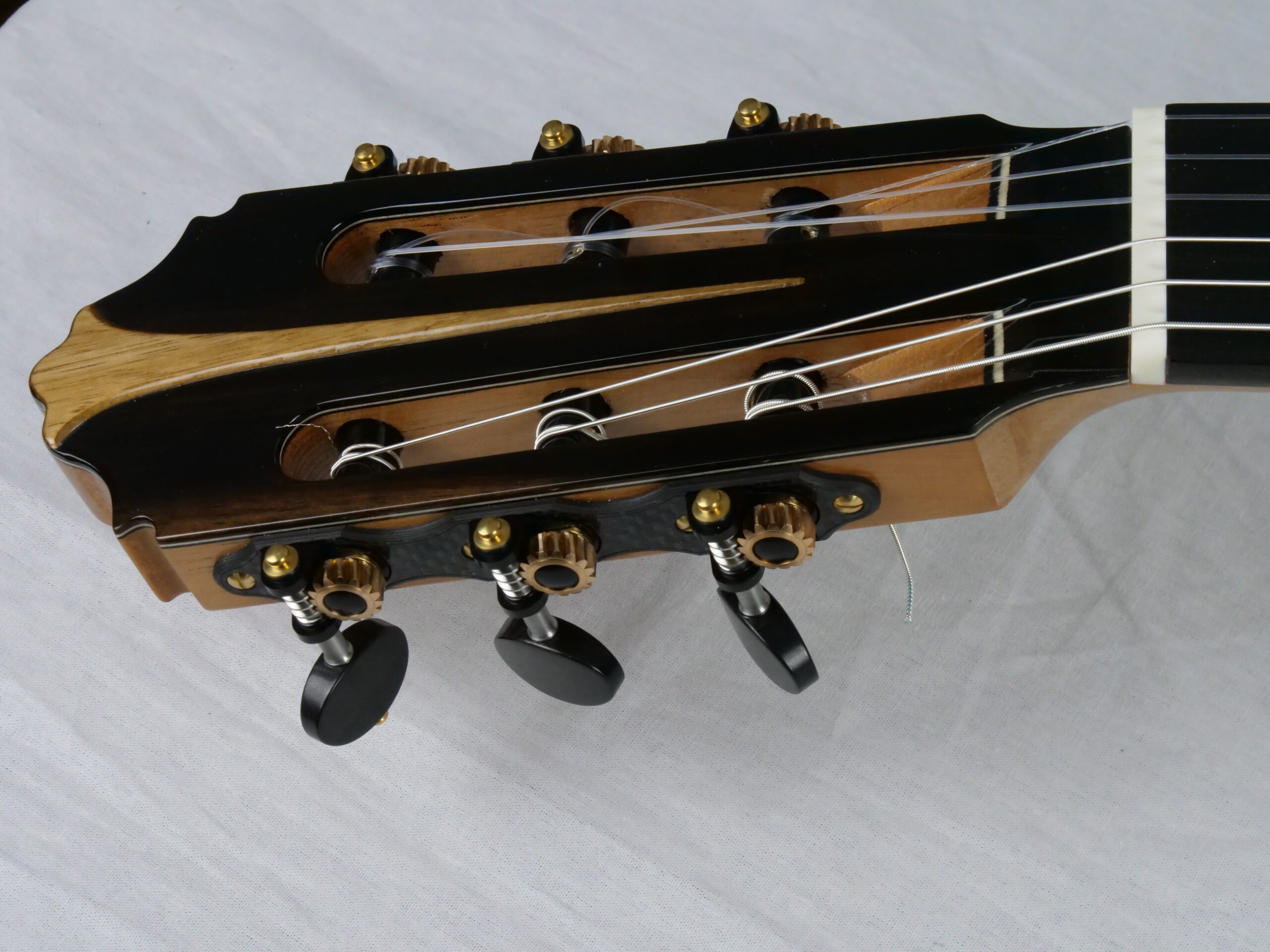 Here we have a lattice braced guitar inspired by the Greg Smallman guitars. Everything has been said on the Greg Smallman sound, this lattice model of Charalampos sounds to us even better. You will find singing warm trebles, very thick notes with a long sustain and as well deep basses more natural sounding than the one you can find on the Greg Smallman guitars. Charalampos has worked in th direction of a more natural sound. The result is amazing.