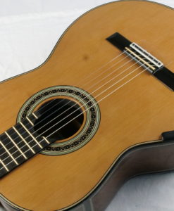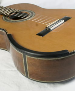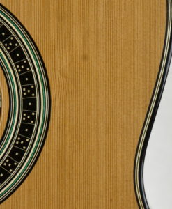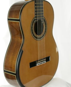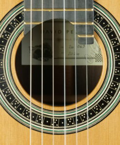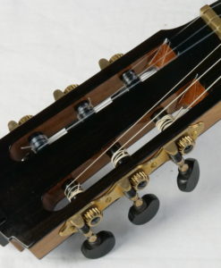 In simple terms, the top has a stepped thickness where large parts of the lower bout areas are exceptionally thinned to 1mm…..not unlike a Smallman. The lattice bracing is using balsa and carbon. The back is double thickness, arched but not carved and heavily braced both with 4 cross braces and 2 longitudinal braces that are housed into the neck and heal blocks. Sides are double thickness and linings are heavy and solid to resist the loss of vibrations. The brass nut/saddle adds a great deal of time-consuming work but brings a magnificence and special quality to the sound.
