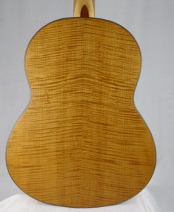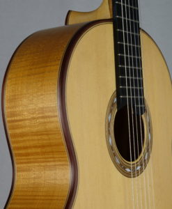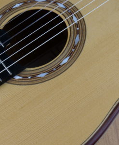 So the guitar Auditorium includes a lattice bracing with a spruce top, awesome solid maple back and side, a specially-developed bridge with some sound holes. The neck has some inlays of black wood which give to the guitar a particular esthetic. The polish used is a mat polish which gives the guitar a very modern blonde look which is quite far from the ‘old spanish’ look of the Portentosa