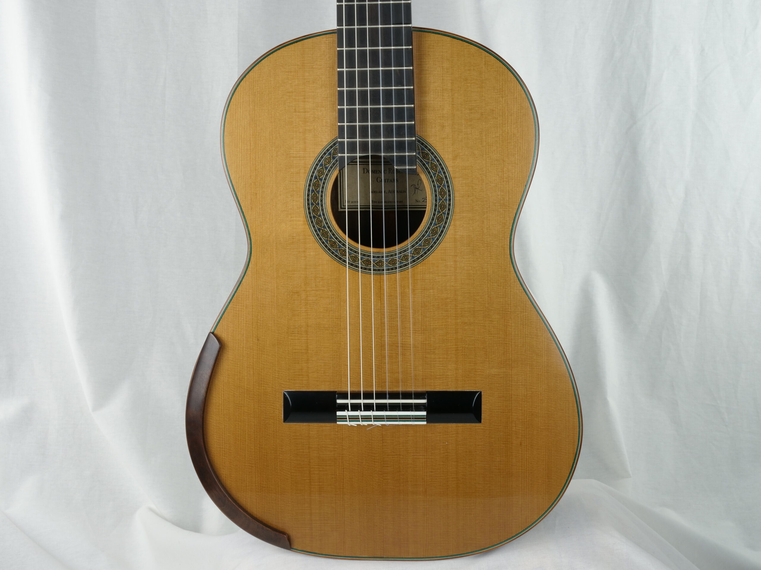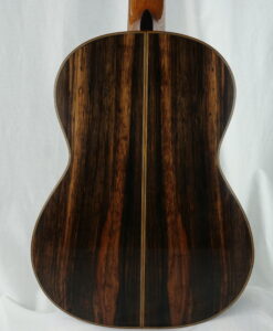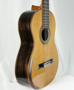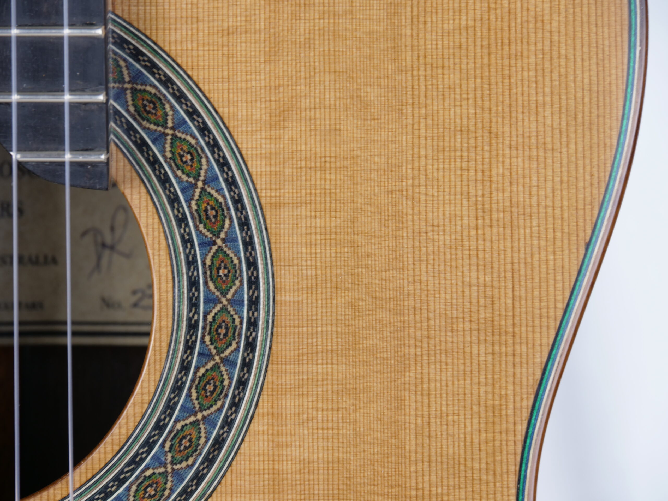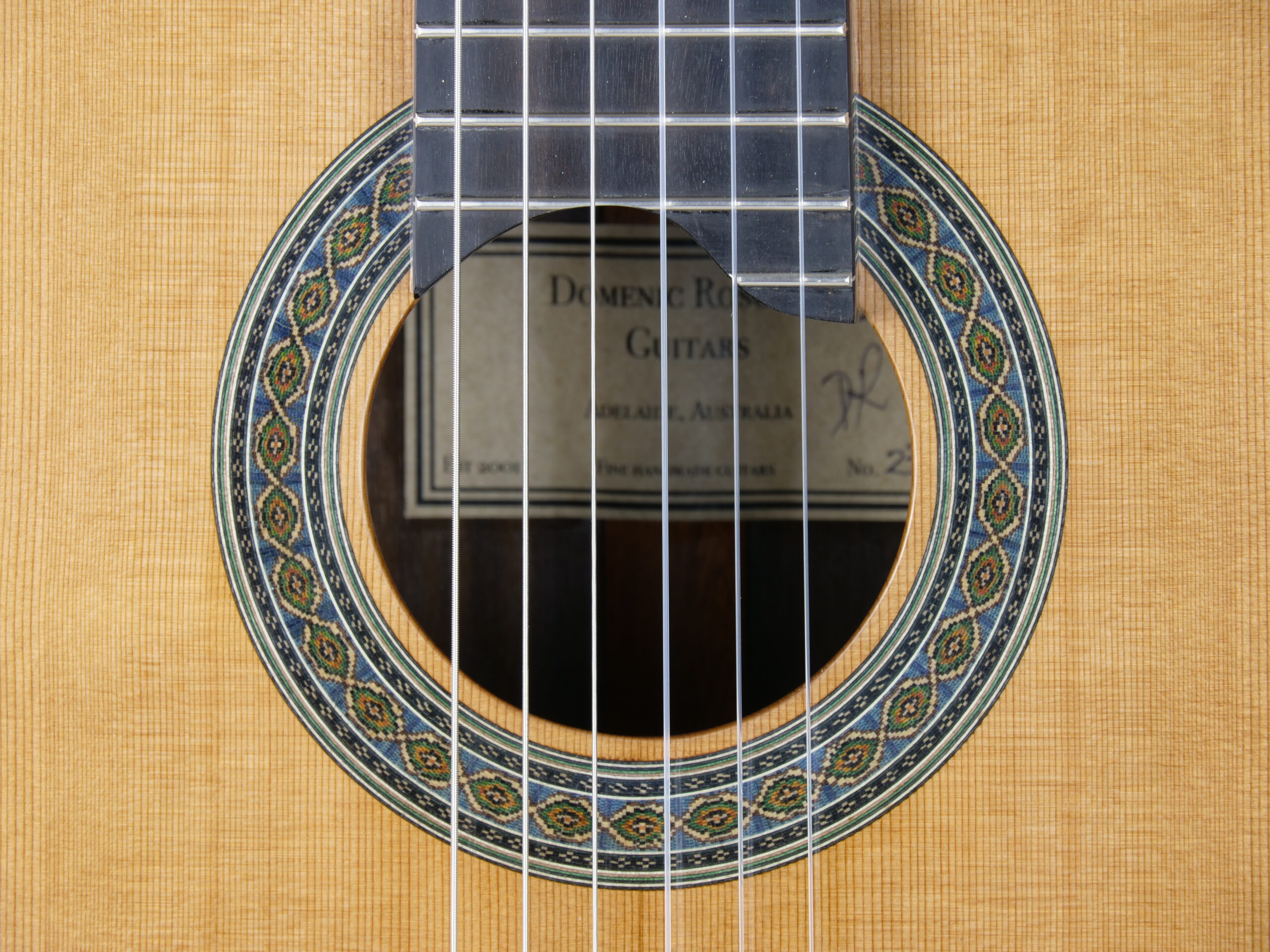 Domenic Roscioli’s guitars are similar but with their own personality to Jim Redgate’s guitars: both are light with the objective of capturing a more natural sound. Both have a rather thick for a more woody sound and a lighter body.