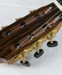 - The back and sides are in Ziricote with nice binding in maple. There are some green filets all around the guitar. The polish is nitrocellulose which is quite a solid polish. Domenic polished the inside of the guitar as well to prevent from moisture. (nice idea).