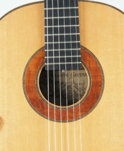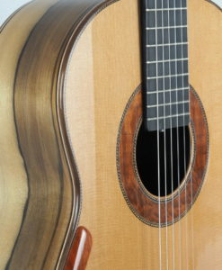 This No. 111 offers as usual the same musical qualities for which Graham Caldersmith guitars are famous : a warm sounding guitar with creamy and singing trebles. However, Graham made some important changes : Whereas the former Concert Model were very dark, there is some more brightness which definitly balanced the warmness which is Graham sound signature. Part of the brightness is due to the adjustment of the notes above the 12th fret to ‘ring’ nicely up to the 20th which gives sustained overtones to the trebles.A classical guitar with a big personality. Loud with a large range of sounds, very loud basses,dark trebles with a great playability. Many french guitarists are playing on Caldersmith guitars. The trebles are creamy and thick and sing like perfection. The tick notes are wonderful and fill up easily big concert hall. Lots of musicality.
