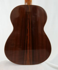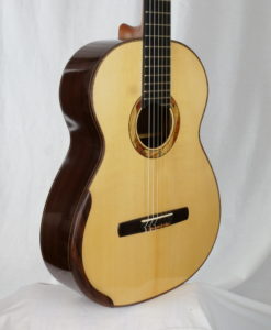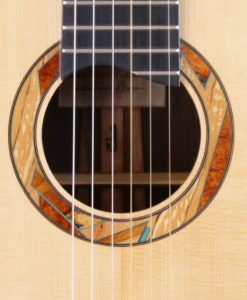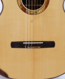 For once, here is a French luthier Jean-Marie Fouilleul who is offering an innovative guitar halfway between a traditional guitar and a lattice guitar. The guitar is a sort of traditional braced guitar with however some carbon in the bracing and a support called Arche inside to strengthen the sides. The craftsmanship is exquisite. The result: a loud guitar with a crystal-clear sound with a great string separation. The guitar has been made in 2016 but is in close to new condition.