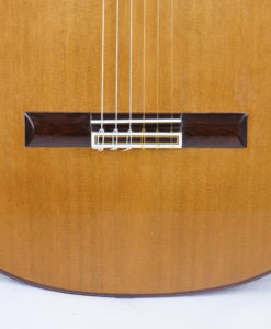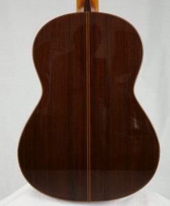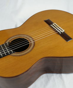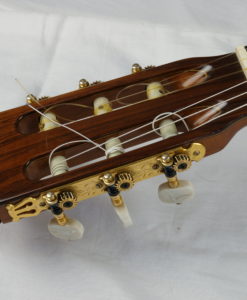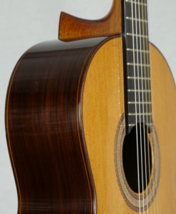 This Especial 1a has like the traditional model a premium red cedar top and beautiful bookmatched Indian rosewood back and sides. The cedar neck is topped with an ebony fretboard and a bone nut and has a strip of ebony for structural reinforcement. The traditional slotted headstock is faced with Indian rosewood and is fitted with engraved exposed gear gold tuners with ivoroid buttons. The rosette is a mosaic of red roses entwined by green stems. The rosewood bridge features a bone saddle and a bone bordered harness for securing the string ends.