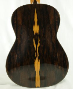 The volume, sustain and evenness of his guitars has to be heard to be believed. Kim builds a magnificent classical guitar, one full of power and voice. Australian style, arched back and sides, lighter top, thin, with tons of energy transmission. Dynamic coloring with power is the sum total, coupled with beautiful workmanship. Kim builds his guitars out of Wentworth Falls Australia.