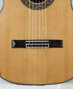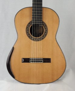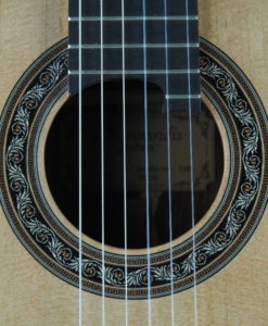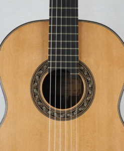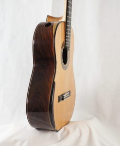 This double-top guitar weight 2.2 kg. The whole guitar is the result of Charalampos analysis and not a copy from the German doubletop. The guitar has a solid Madagascar rosewood back and an unusual for doubletop double-side which gives more mass to the guitar and long sustain. The bracing is made with balsa and carbon to bring more brightness to his guitar (doubletop use to be too round and warm).