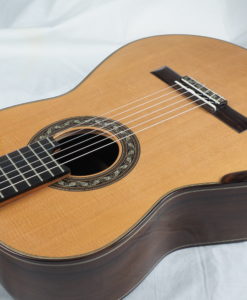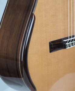 Here we have a lattice braced guitar inspired by the Greg Smallman guitars. Everything has been said on the Greg Smallman sound, this lattice model of Charalampos sounds to us even better. You will find singing warm trebles, very thick notes with a long sustain and as well deep basses more natural sounding than the one you can find on the Greg Smallman guitars. Charalampos has worked in th direction of a more natural sound. The result is amazing.