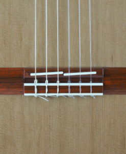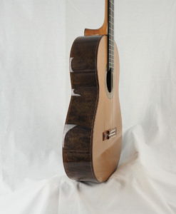 By coupling this type of soundboard with an arched, brace less back, sustain and projection are also greatly enhanced.