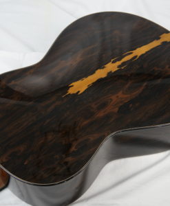 The volume, sustain and evenness of his guitars has to be heard to be believed. Kim builds a magnificent classical guitar, one full of power and voice. Australian style, arched back and sides, lighter top, thin, with tons of energy transmission. Dynamic coloring with power is the sum total, coupled with beautiful workmanship. Kim builds his guitars out of Wentworth Falls Australia.