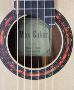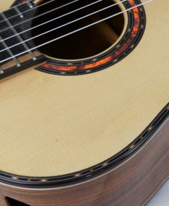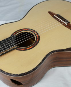 Early this year we received a wonderful Cedar top Doubletop guitar. The guitar has been sold within a few days. Here is a Spruce DT which is very different from the usual German DT guitars. The guitar is very light, with a top made of 2 slices of spruce/cedar (not 3 slices like the regular DT). For the back and sides, Max took an attractive set of Santos Rosewood. The sound is big and is offering a wonderful spruce tone!.