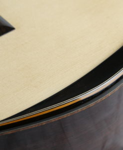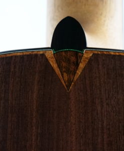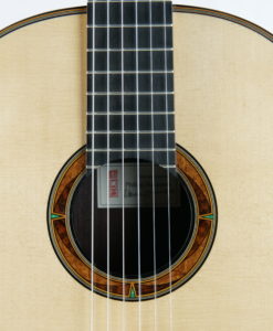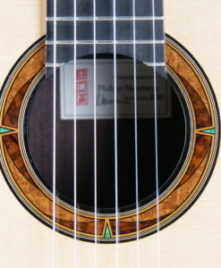 Since I started my own business in 2004, I have repeatedly refined the design, the construction, and thus the sound from guitar to guitar. The sound top is now supported by fine cedar strips inlaid in the wood, similar to the veins of a leaf. This integrated support structure stiffens the top without additional weight and distributes the sound waves evenly over the entire surface. The result is a highly sensitive top that optimally amplifies even the smallest vibration of the strings. The invention of an integrated armrest with binding and the use of precious stones for the soundhole decoration is also special in the classical guitar world.