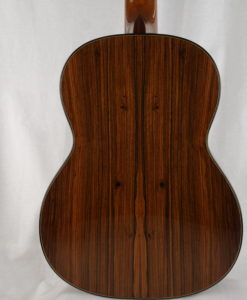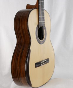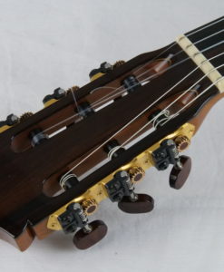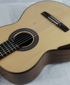 Robin’s guitars are different from classical guitars with lattice bracing, but offer the same power and surprising projection. The harmonics are rich and have incredible resonance. The high notes are sustained for a surprisingly long time, while the bass notes are very well balanced. The result is a very elegant, tuneful tone. The spruce adds brilliance. The adjustments are perfect and the sound spectacular. A cedar top and stunning South American rosewood guitar from Robin. His classical guitars use an almost carbon-free radial barring and are very similar to the guitars made by Simon Marty, with whom he has perfected this technique. A powerful, very well-balanced tone, premier-quality materials and meticulous guitar-making, with a crystal clear notes and huge string separations.