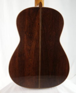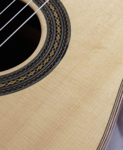 For this 2022 guitar, we selected with Mario Aracama a wonderful set of Madagascar rosewood and a superb spruce top very lightly braced. One very interesting thing which is a key feature in Mario’s process of making the guitar: he assembles his tops years before assembling the guitar. He makes sure all the tops stay in a regular moisture content room with some applied tensión on them. This allows choosing the best top which is then matured which helps the guitar to be right opened the very first day. The top of this guitar for instance has been glued in October 2019 and has spent more than 2 years stored with tension on it. It helps to settle down the whole top working as a unified piece and gain the required stiffness in order to receive string tension.