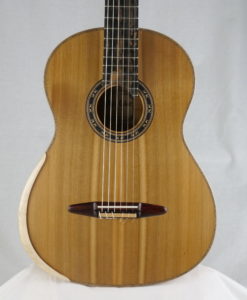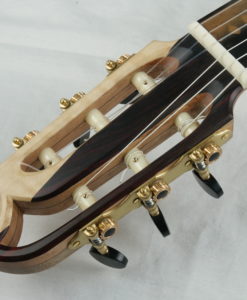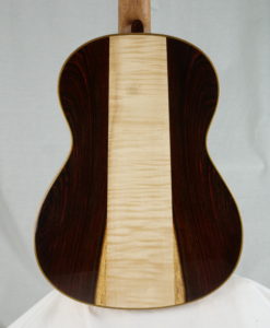 Once again, here is an eye-catching Cedar top Doubletop guitar from Max. The guitar is not only gorgeous looking but sounds like a dream. Here is as usual a cedar DT which is very different from the usual German DT guitars. The guitar is very light, with a top made of 2 slices of cedar/spruce (not 3 slices as on the regular DT). For the back and sides, Max took an attractive set of cocobolo and maple Rosewood. The sound is big and the playability is amazing. You should have a look to the review video.