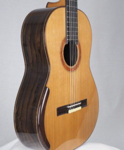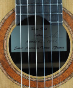 This is a lattice classical guitar made by a French guitar maker. Régis Sala is a French guitar maker who is building classical guitars with the pure French traditional classical guitar methods. However, Régis has decided to build for us his own vision of a lattice classical guitar which combines the best of both worlds of lattice and traditional guitars. The result is amazing: long sustain and beautiful tone.