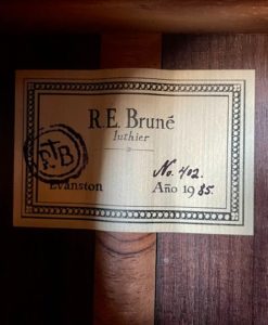 “Beginning in 1966 Richard Bruné made his first guitar using wood salvaged from his parent’s dining room table for the sides and back. Made because he could not afford to buy a good guitar, this first instrument which can still be seen and played today at the Bruné shop proved to be instrumental (pun intended) in his career, which began as a professional flamenco guitarist and evolved into his present occupation as a luthier.