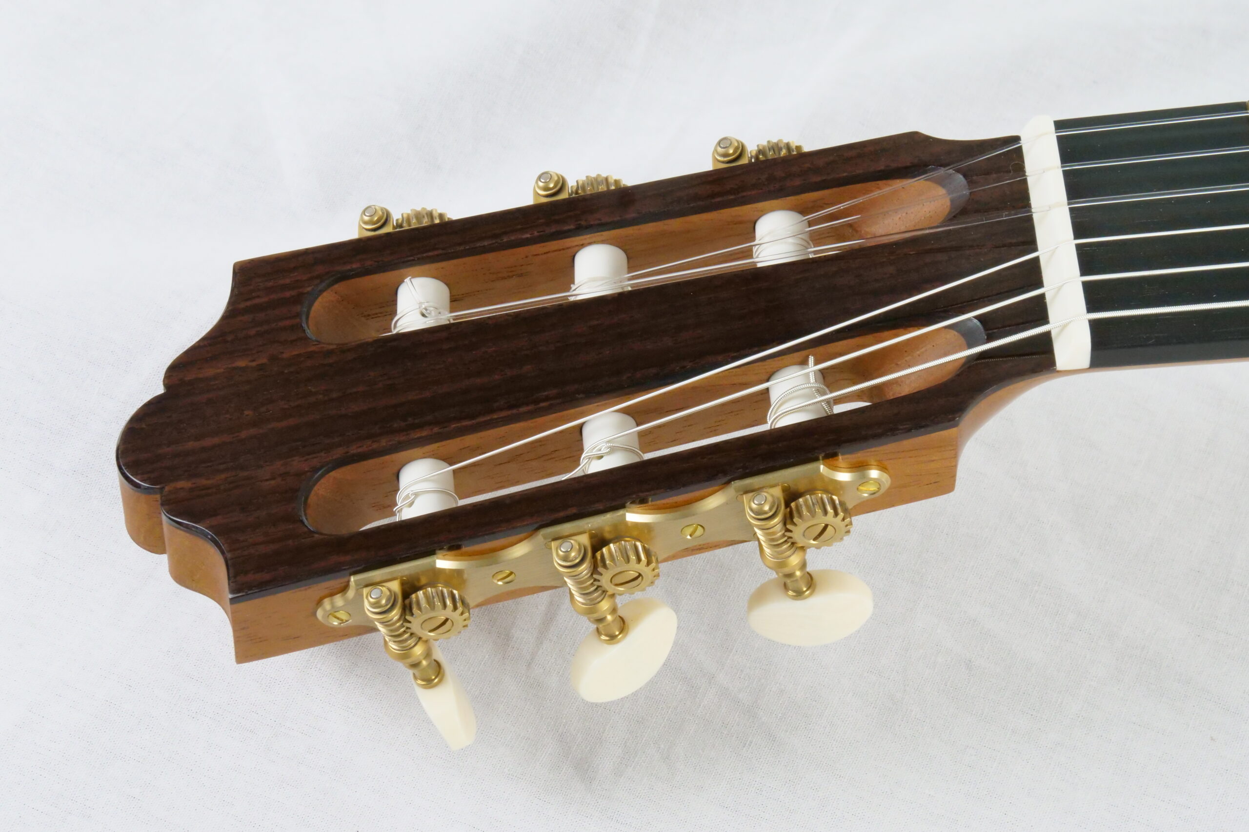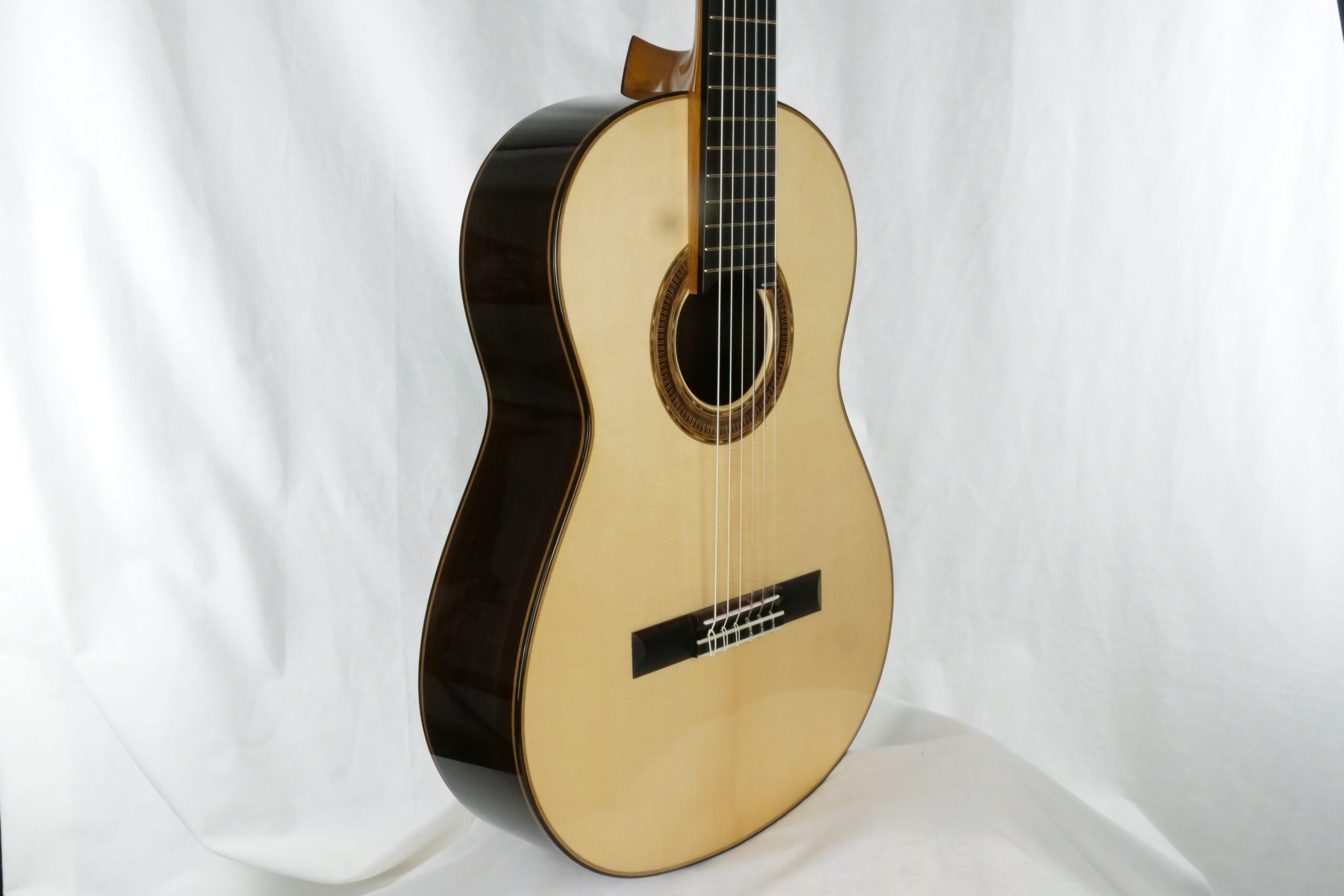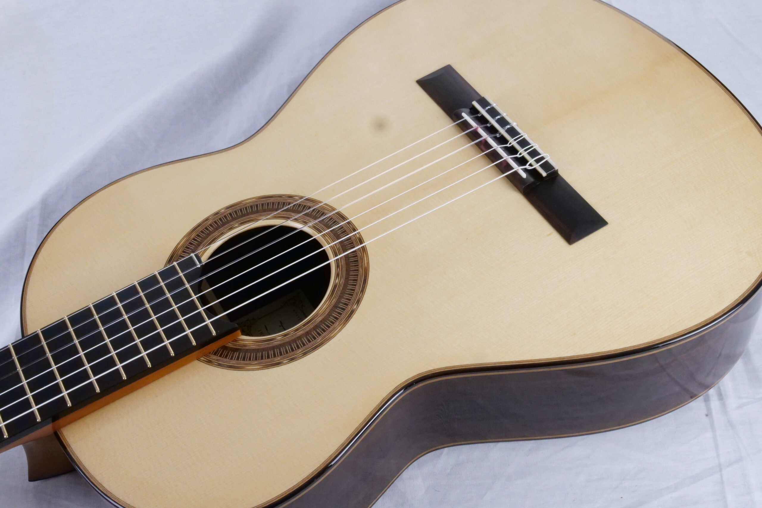 Here are some verbatim from Ryosuke : “I was learning structural mechanics at a university but I left it for some reasons. And I started to learn guitar making. After 7 years training including 2 years apprenticeship program under Sergei de Jonge and 3 years apprenticeship program under Kenji Sugita(http://www.sugitakenji.com), I started my own business in 2014. Now I’m making about 12 guitars a year for not only for Classical guitarist but also for Brazilian music musicians, Jazz musicians, steel strings players.”