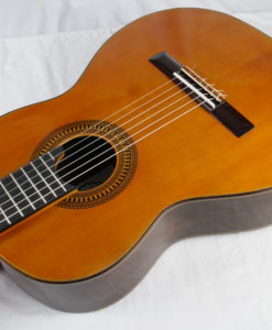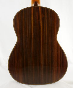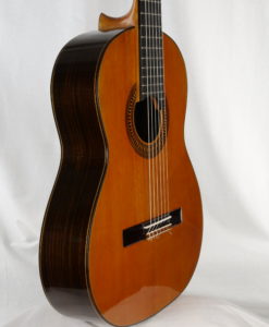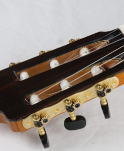 When we received Saeid’s guitar, we have been stuck with the wood quality used for both the back and sides and the top. The Indian rosewood is very figured and really looks like a Madagascar rosewood. The cedar top is thin and one can see the balsa bracing depending on the light. The guitar is light as most of the double-top. The rosette is I guess inspired by the Cordoba architecture and is wonderful.