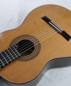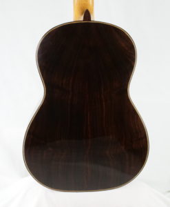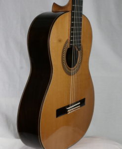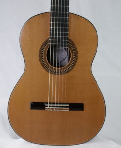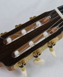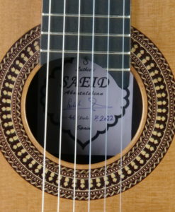 When we received Saeid’s guitar, we have been stuck with the wood quality used for both the back and sides and the top. The Indian rosewood is very figured and really looks like a Madagascar rosewood. The cedar top is thin and one can see the balsa bracing depending on the light. The guitar is light as most of the double-top. The rosette is I guess inspired by the Cordoba architecture and is wonderful.